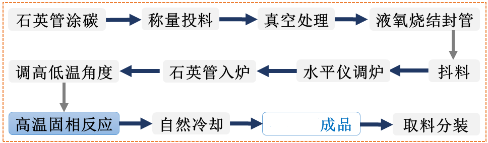 高溫固相合成是在高溫下,固體界面間經(jīng)過接觸、反應(yīng)、成核、晶體生長反應(yīng)而生成一大批化合物。高溫固相法制備工藝簡單,合成的粉體無團聚、填充性好,具有成本低、產(chǎn)量大等優(yōu)點,是工業(yè)生產(chǎn)上常用的方法。將反應(yīng)原料按不同摩爾比精確稱量,混勻后裝入涂碳石英管,經(jīng)液氧燒結(jié)真空封管后裝爐。根據(jù)反應(yīng)原料的不同性質(zhì),控制不同的反應(yīng)溫度。