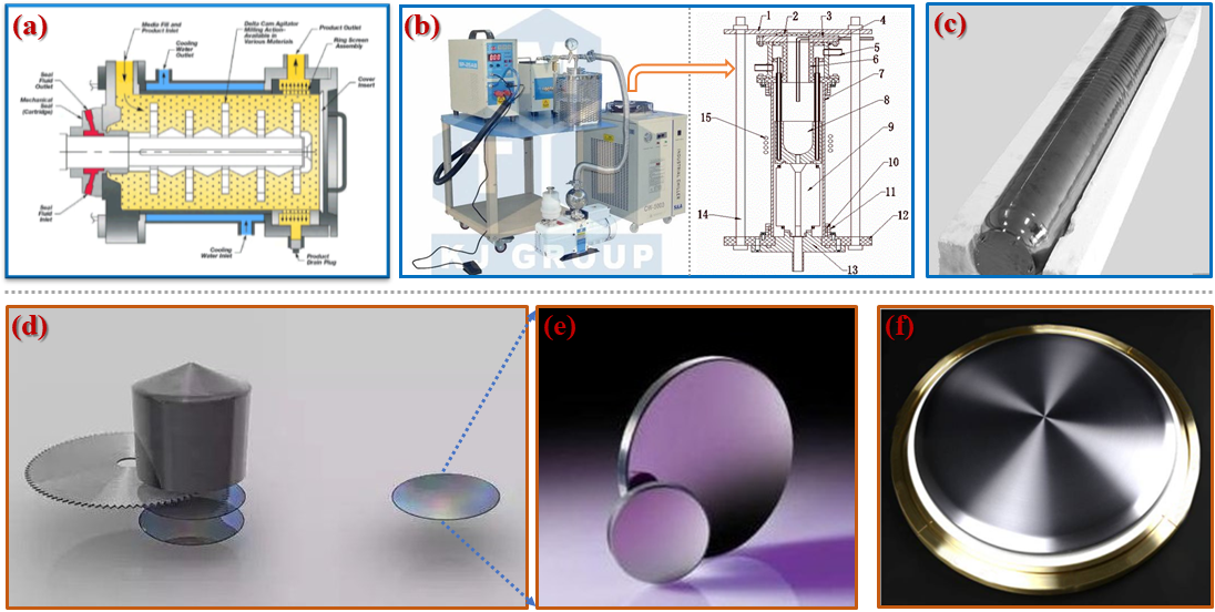 圖2 (a) 球磨示意圖;(b) 熔煉鑄造爐及其熔煉機理示意圖;(c) 制備的多晶棒的實物圖 (表面光亮呈現(xiàn)鏡面反光);(d) 晶錠切片示意圖;(e) 經(jīng)過打磨、拋光后的靶材;(f) 綁定銅背板后的靶材成品。
