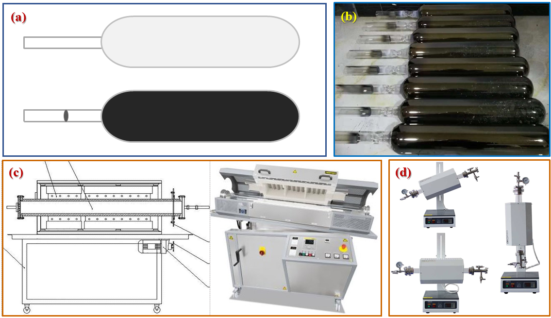 圖1 (a) 石英管涂碳和液氧燒結(jié)的示意圖;(b) 投料后的涂碳石英管實拍圖; (c) 可旋轉(zhuǎn)高溫反應(yīng)爐的示意圖和實物圖; (d) 調(diào)節(jié)不同角度的高溫反應(yīng)爐。
